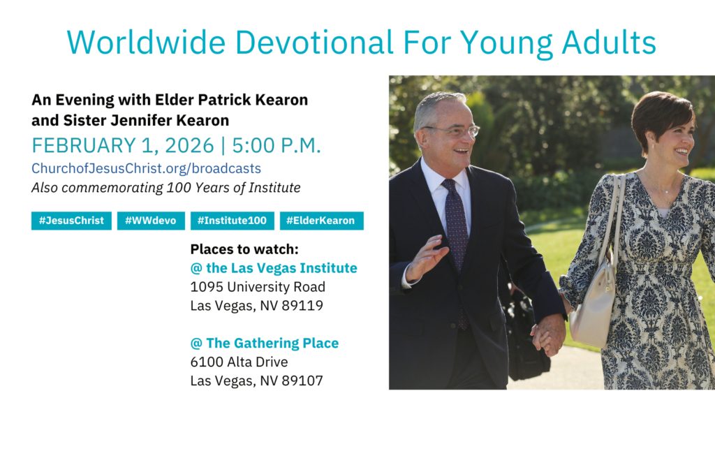 Mark your Calendars! Elder and Sister Kearon’s Devotional Broadcast is Sunday, February 1, 5pm. Please come watch at The Gathering Place or the UNLV LDSSA building to celebrate 100 years of Institute!