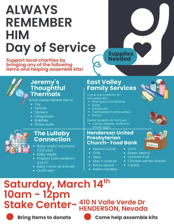 We’ll be supporting local charities by bringing needed items and assembling service kits for those in need. This is a wonderful opportunity for individuals and families to serve side-by-side and truly “always remember Him” through Christlike love in action.