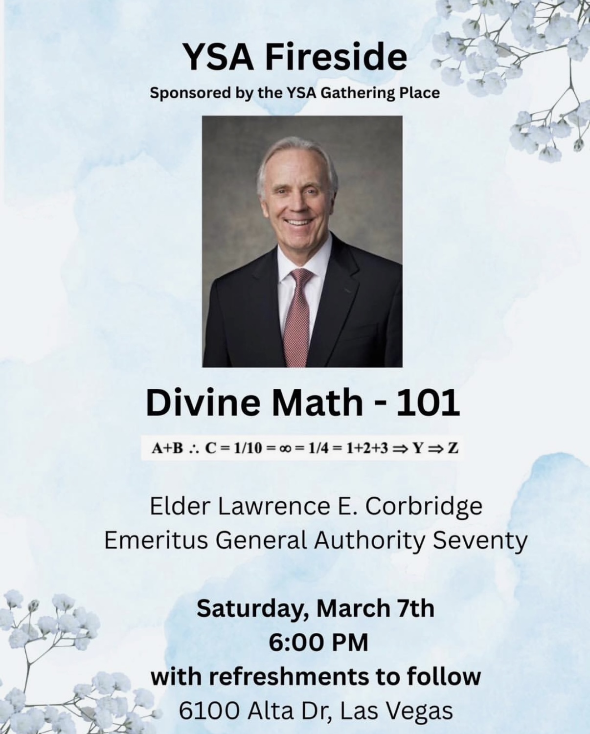 Emeritus General Authority Seventy Lawrence E Corbridge will speak. This will be a unique opportunity to hear some amazing Spiritual insights from a lifelong church leader. Refreshments will follow.