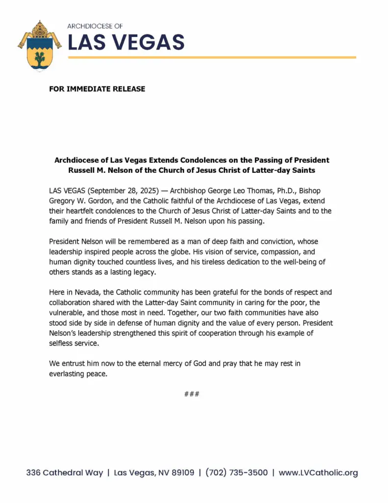 लास वेगास के आर्चडायोसीज़ से शोक पत्र